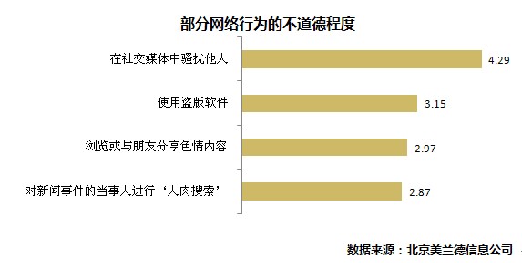 哪些行為在網(wǎng)絡(luò)世界中最不道德?調(diào)查顯示,“在社交媒體中騷擾他人”被認(rèn)為最不道德;其次是“使用盜版軟件”;“瀏覽或與朋友分享色情內(nèi)容”以及“對新聞事件當(dāng)事人進(jìn)行人肉搜索”這兩項(xiàng)行為被認(rèn)為處于“一般”和“輕微不道德”之間。