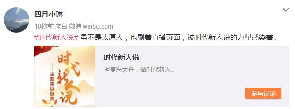 #時(shí)代新人說(shuō)#微博話題下不乏這樣的留言:“太原乃至全國(guó),都被‘時(shí)代新人說(shuō)’刷屏了”、“雖不是太原人,也刷著直播頁(yè)面,被時(shí)代新人說(shuō)的力量感染著”。