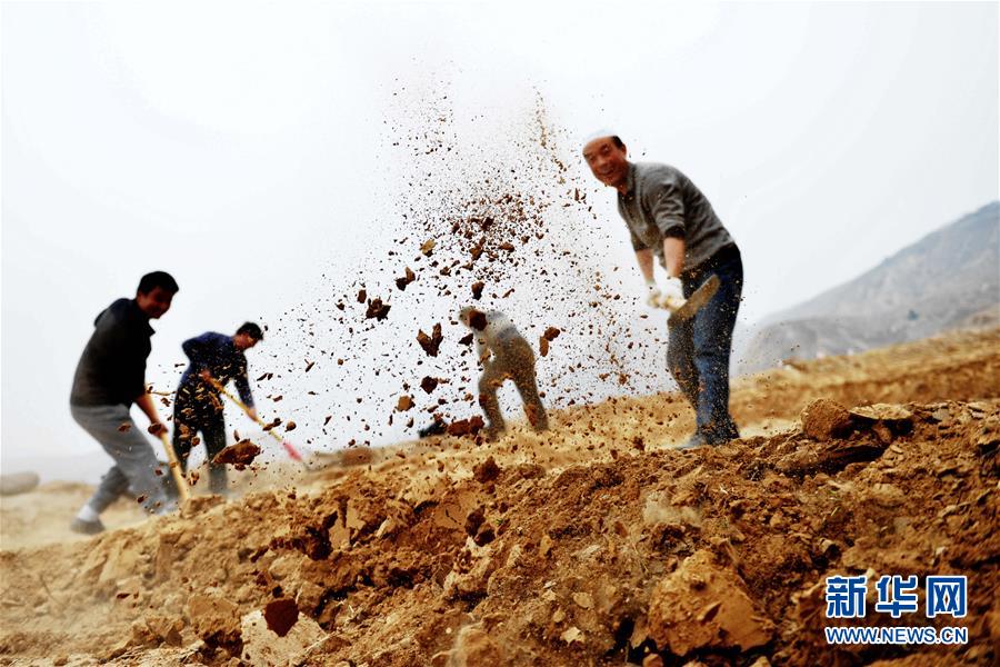 甘肅臨夏回族自治州駐村扶貧干部在幫助農民平地種樹。(新華社)