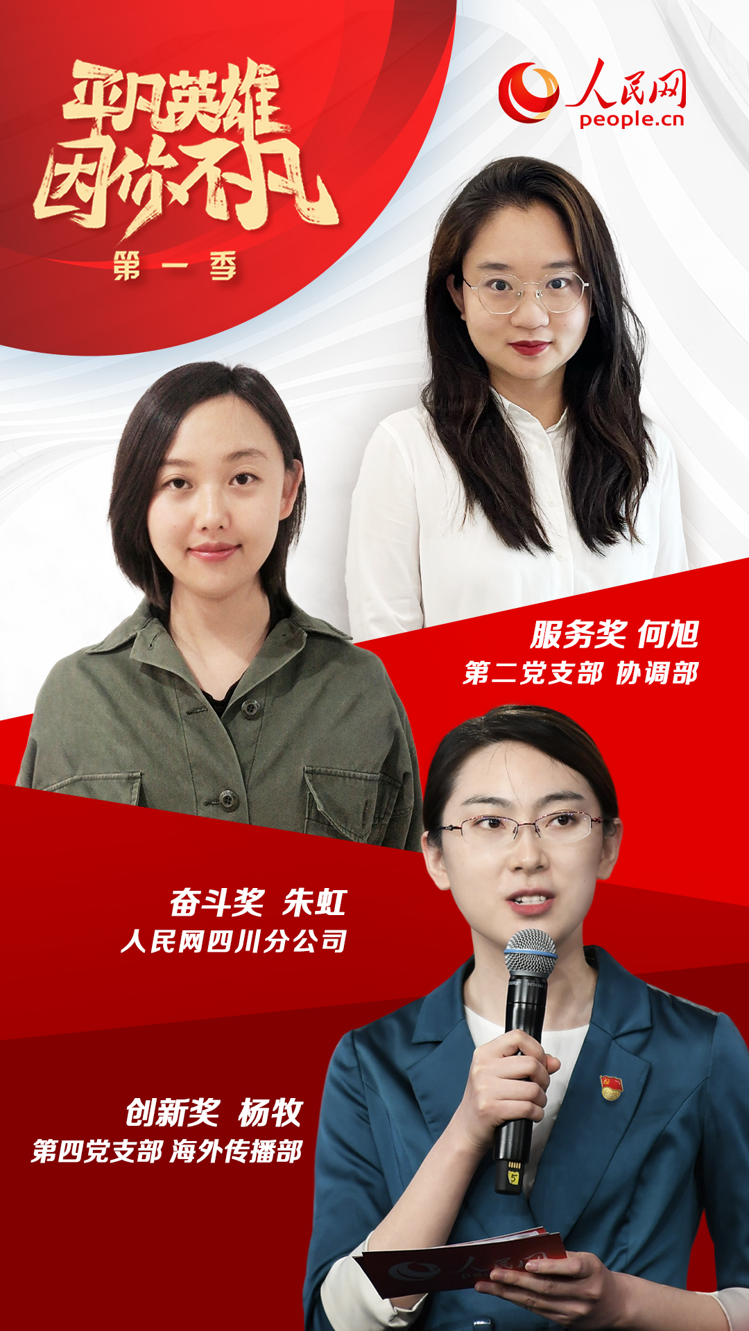 經(jīng)過激烈比拼,第二黨支部何旭(協(xié)調(diào)部)、第四黨支部楊牧(海外傳播部)、四川分公司朱虹三位同志最終分獲“平凡英雄”服務(wù)獎(jiǎng)、創(chuàng)新獎(jiǎng)和奮斗獎(jiǎng)。同時(shí),第七黨支部董曉偉(網(wǎng)絡(luò)評論部)、第十一黨支部厲姣(紀(jì)檢監(jiān)察室)、第十三黨支部鄭瀟瀟(移動(dòng)內(nèi)容部)、第二十一黨支部張利娟(人民視聽科技有限公司)、安徽分公司李希、山西分公司馬瑩等六位同志獲得“平凡英雄”入圍獎(jiǎng)。